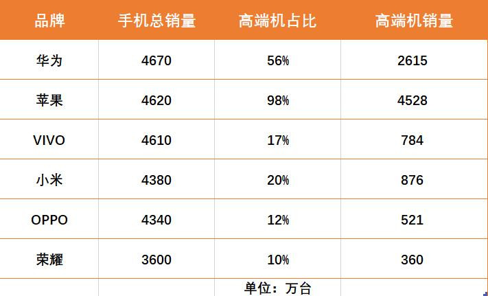 这之后的差距就拉开了:小米高端机销量约876万台,VIVO约784万台,OPPO约521万台,荣耀约360万台。